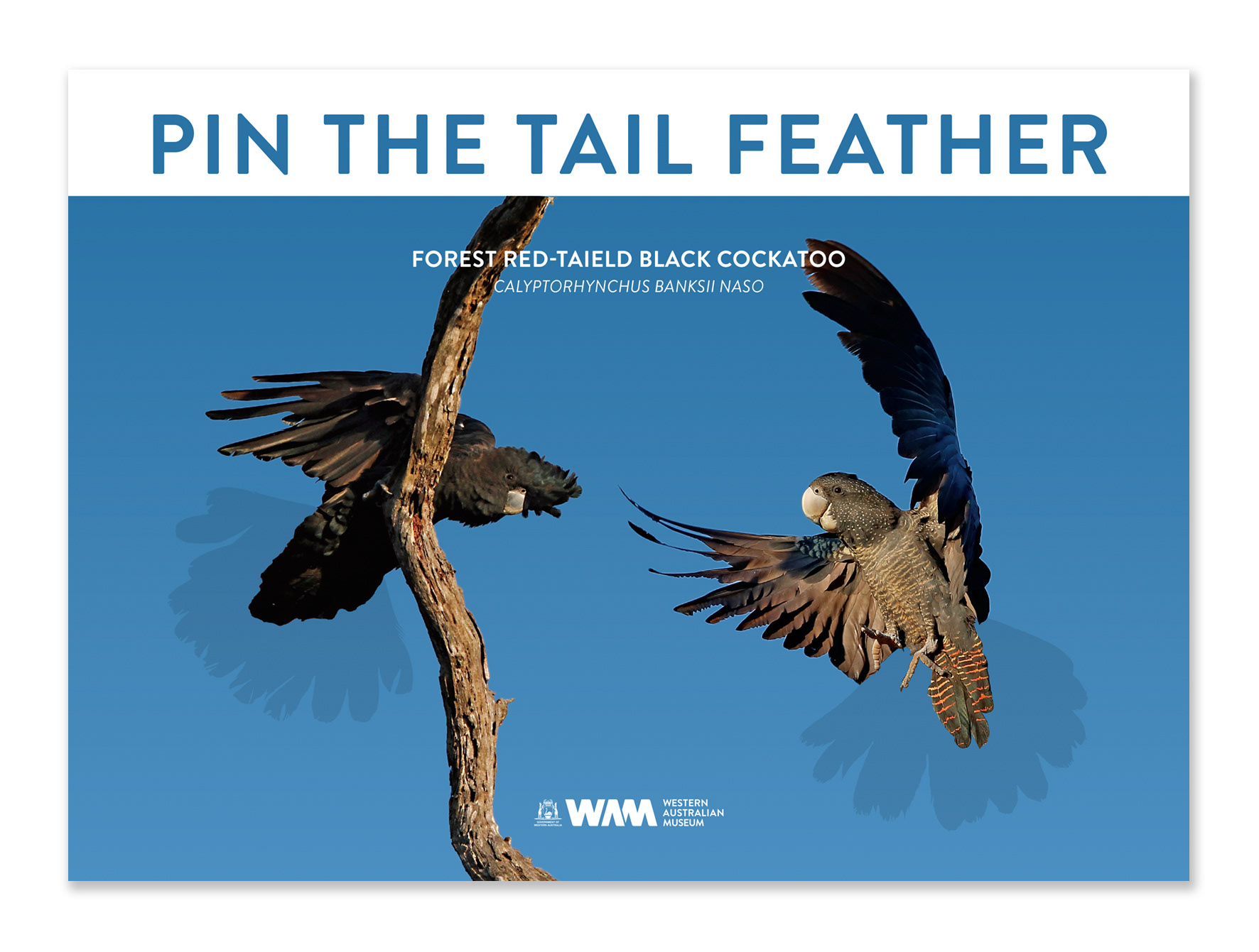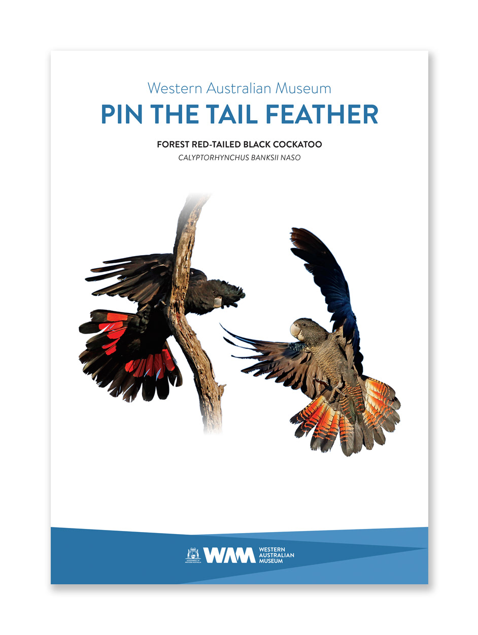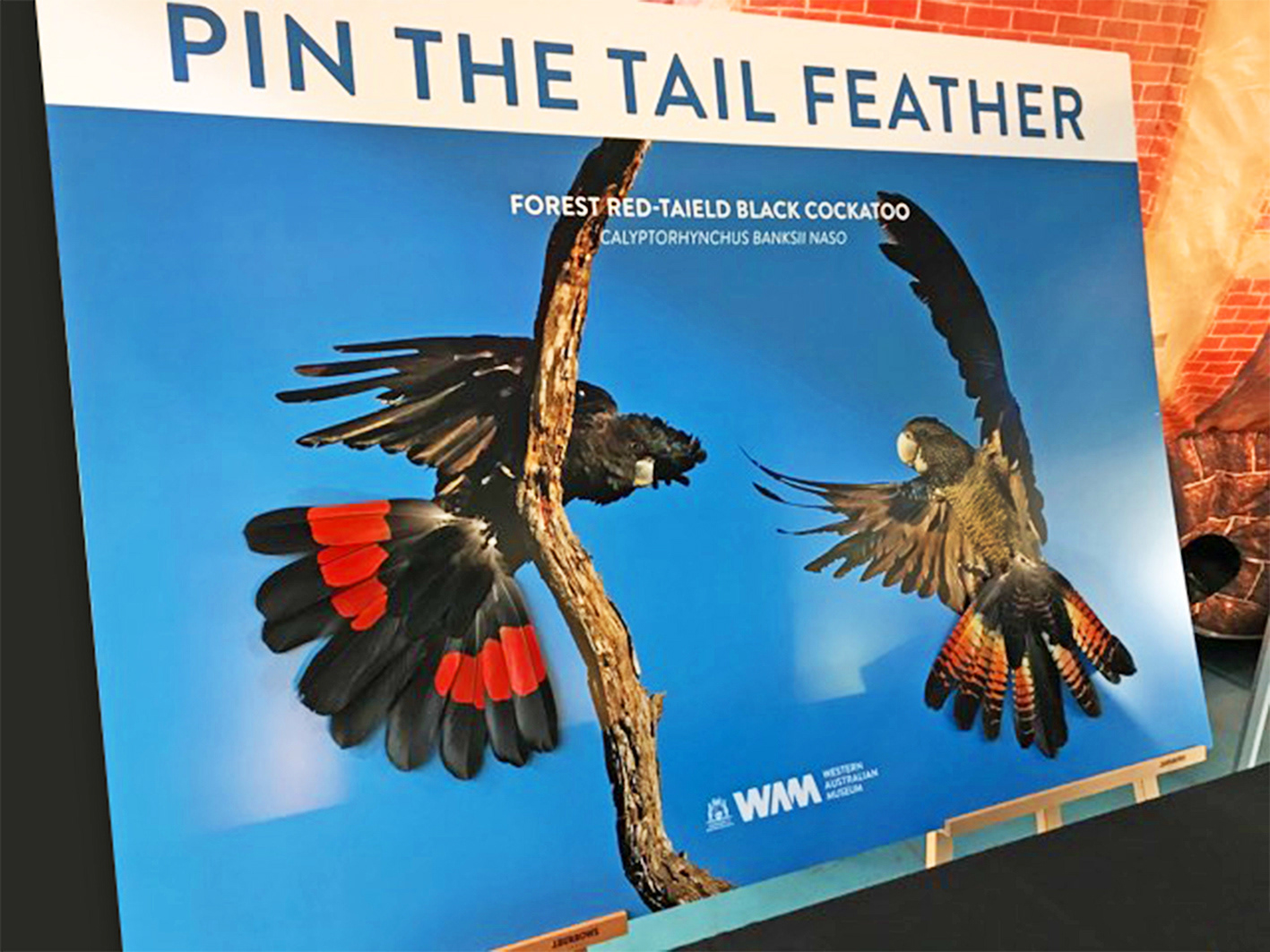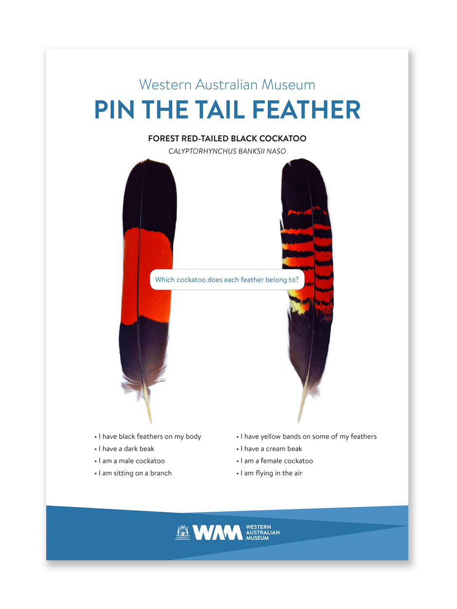 Magnetic pin board art scaled so that birds appear at actual size – so kids can magnetically pin real cockatoo feathers to the bird's tails