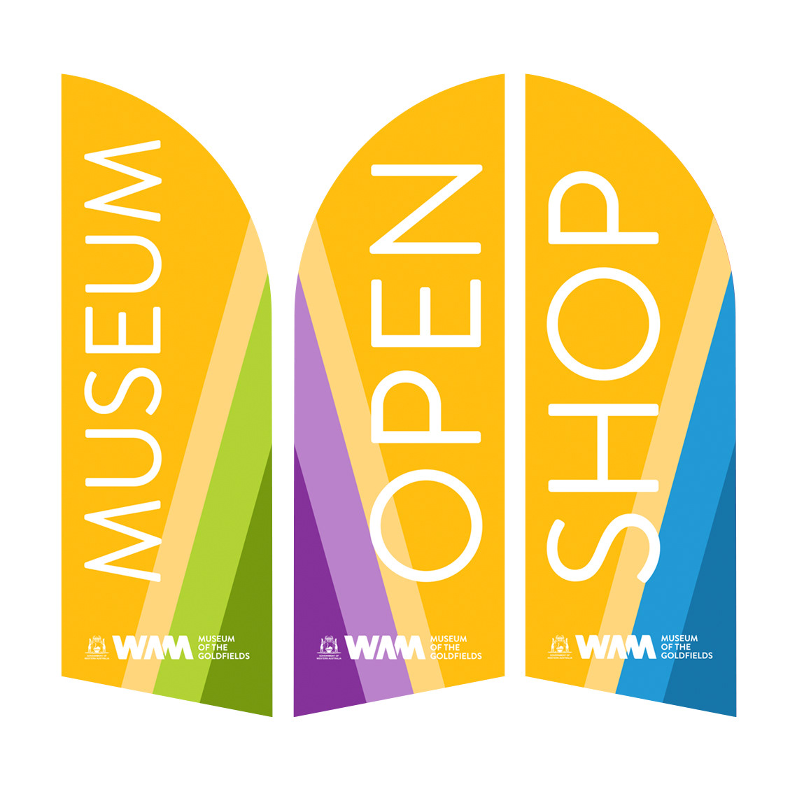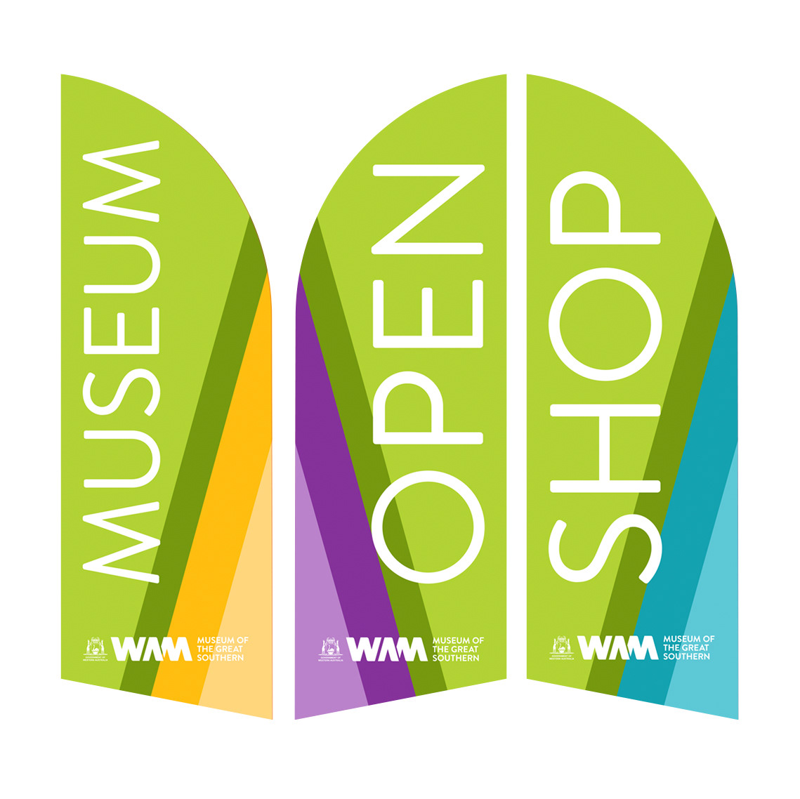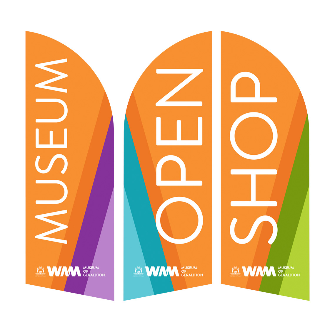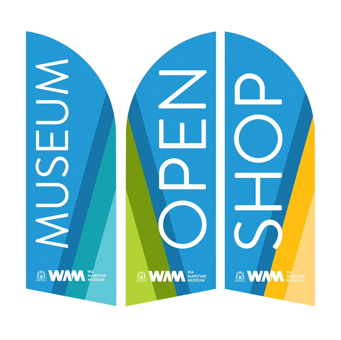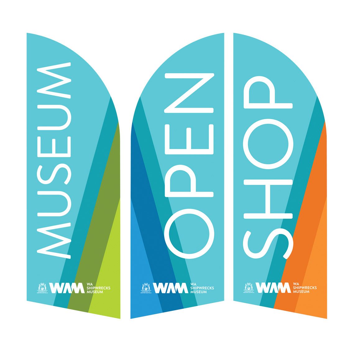 design fabric flag banners for the 5 WA Museum sites around the state, applying the new branding look & feel